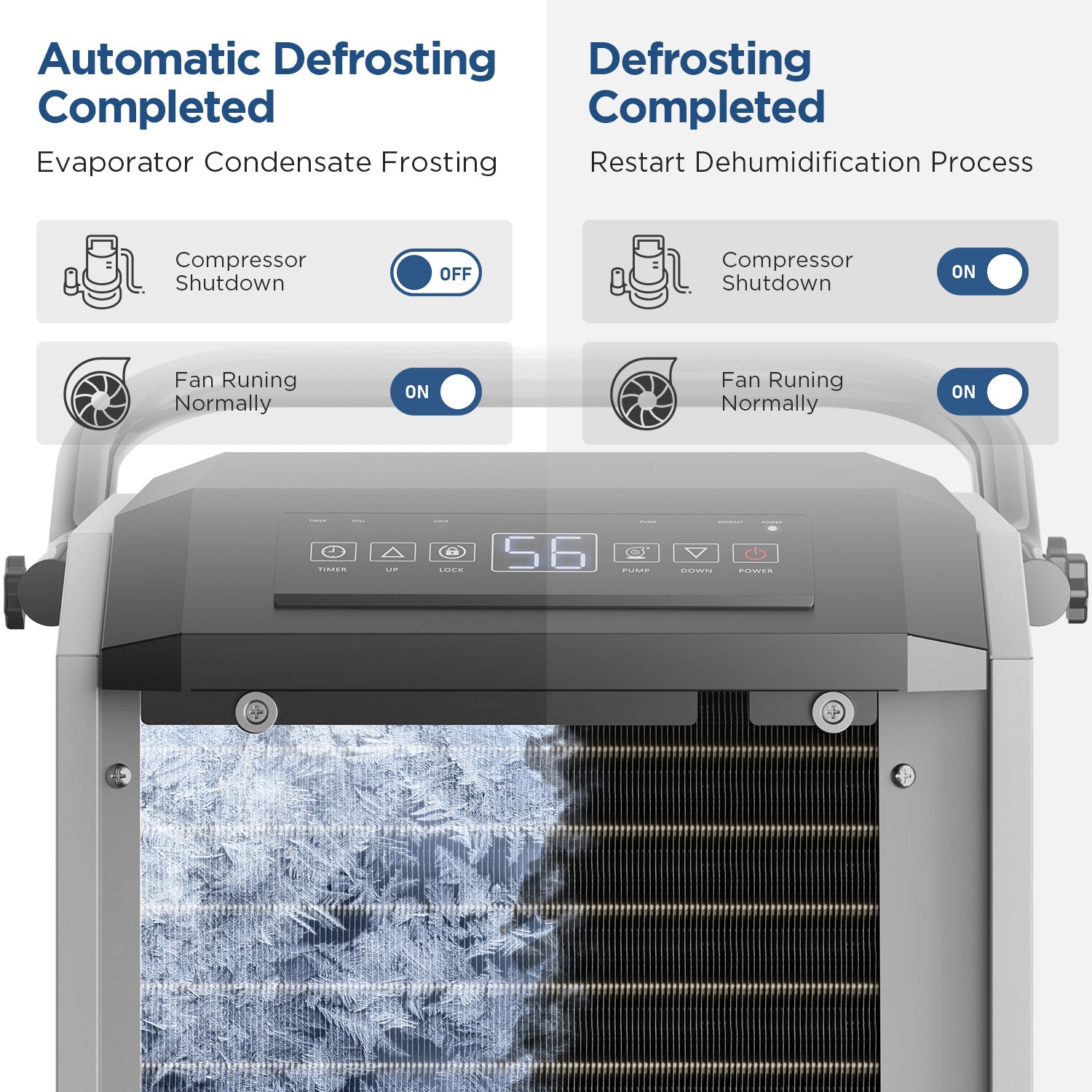 - 【Timing Mode】The timing mode of the industrial dehumidifier allows you to organize your time in a more planned way, it has two working modes, one is to set the time for the dehumidifier to start working in the time range of 0-24 hours, when the timing is over, the dehumidifier will start to work; the other one is a kind of time that is used to set the time for the dehumidifier's working time within the time range of 0-24 hours, when the timing is over, the dehumidifier will stop working.